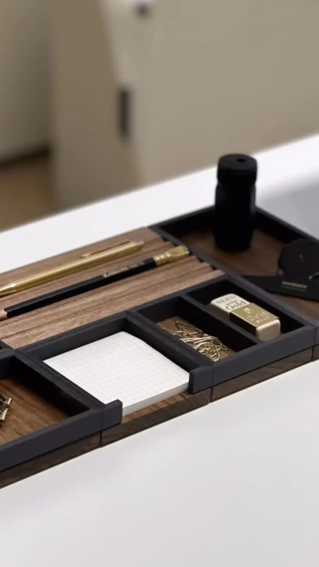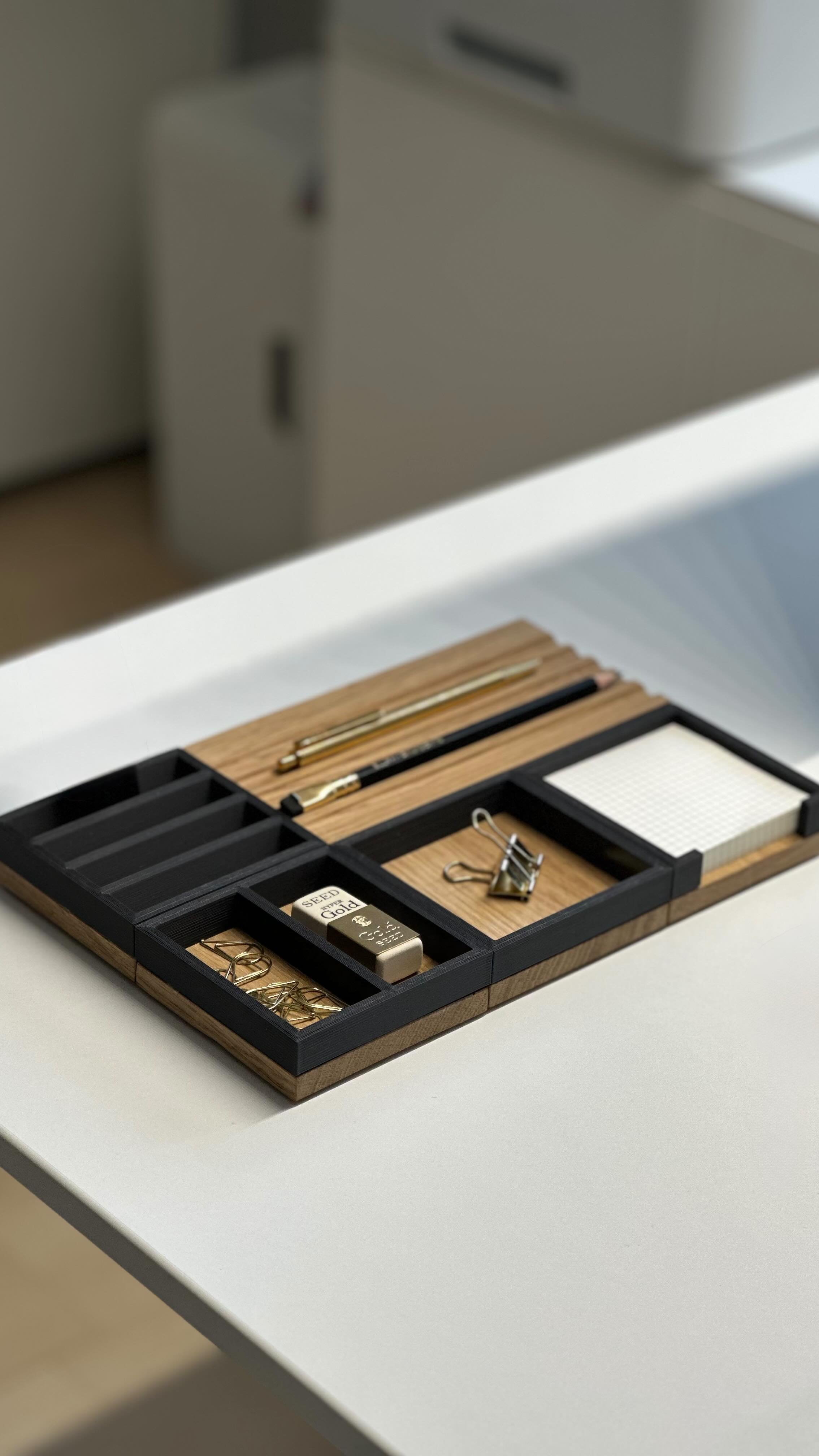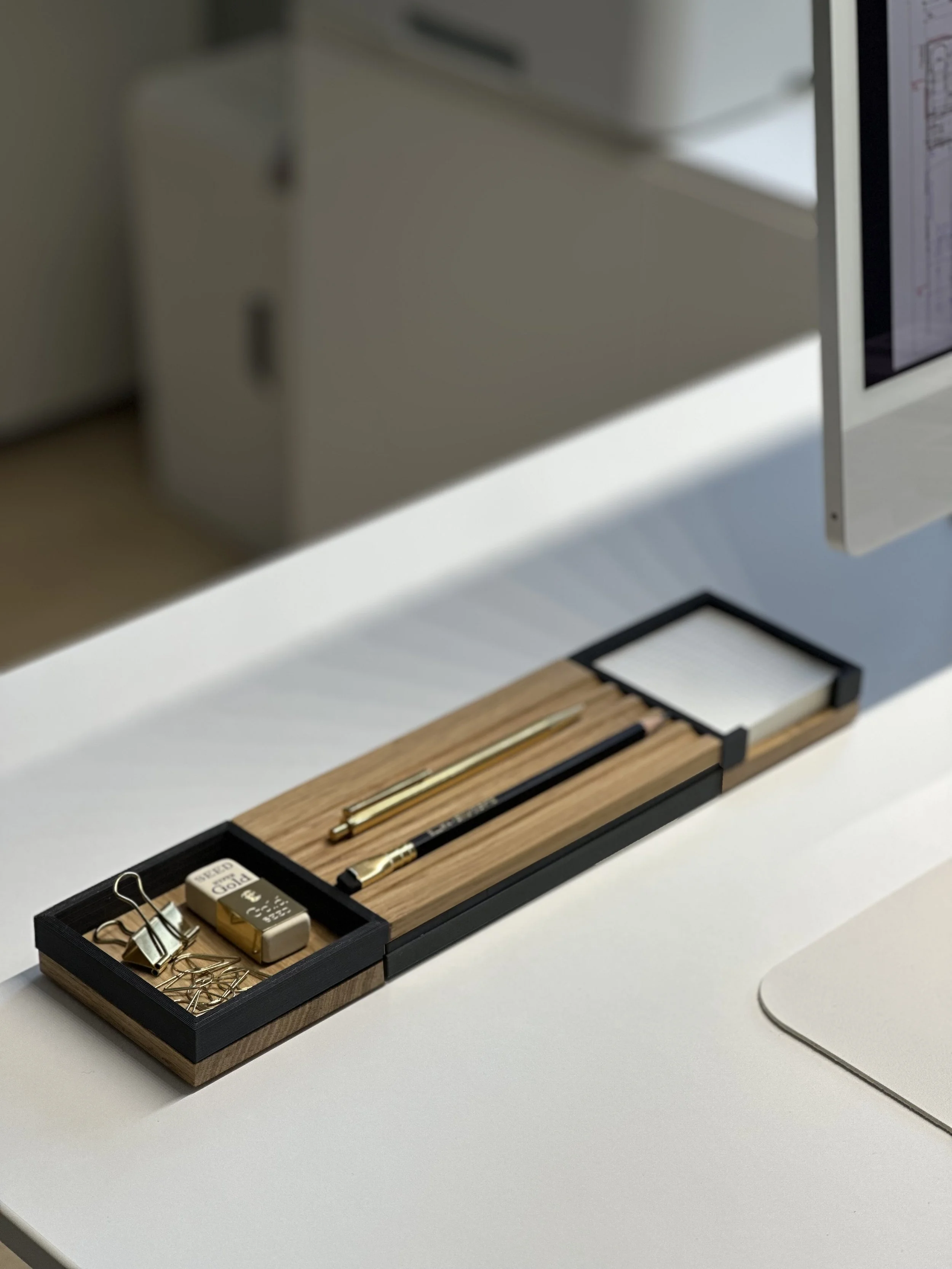 Verwandle deinen Schreibtisch in einen Ort der Klarheit und Inspiration – mit unserem modularen Desk-Organizer aus massivem Holz in modernem Design.