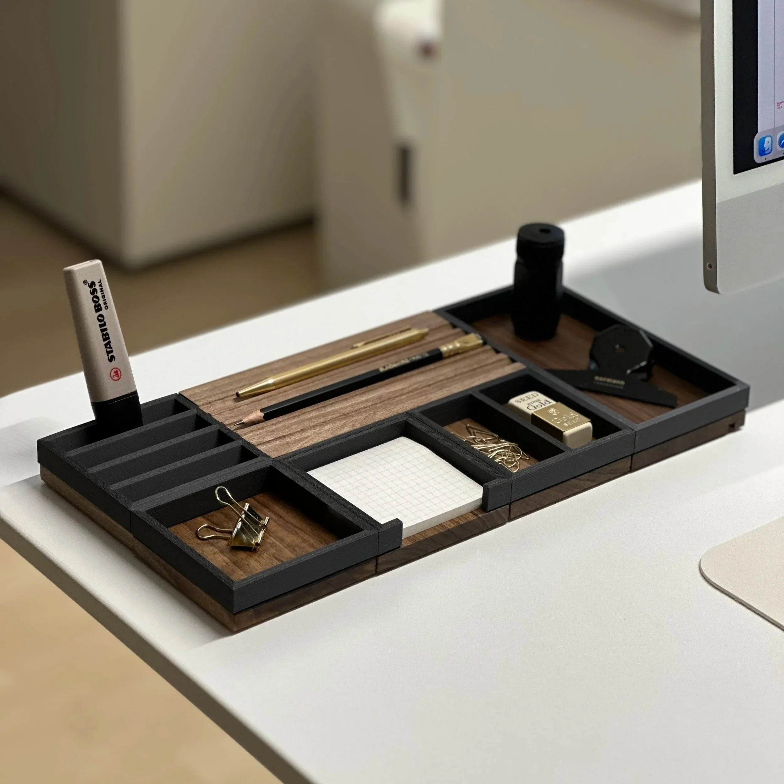 Verwandle deinen Schreibtisch in einen Ort der Klarheit und Inspiration – mit unserem modularen Tisch Organizer System aus massivem Holz und modernem Design.