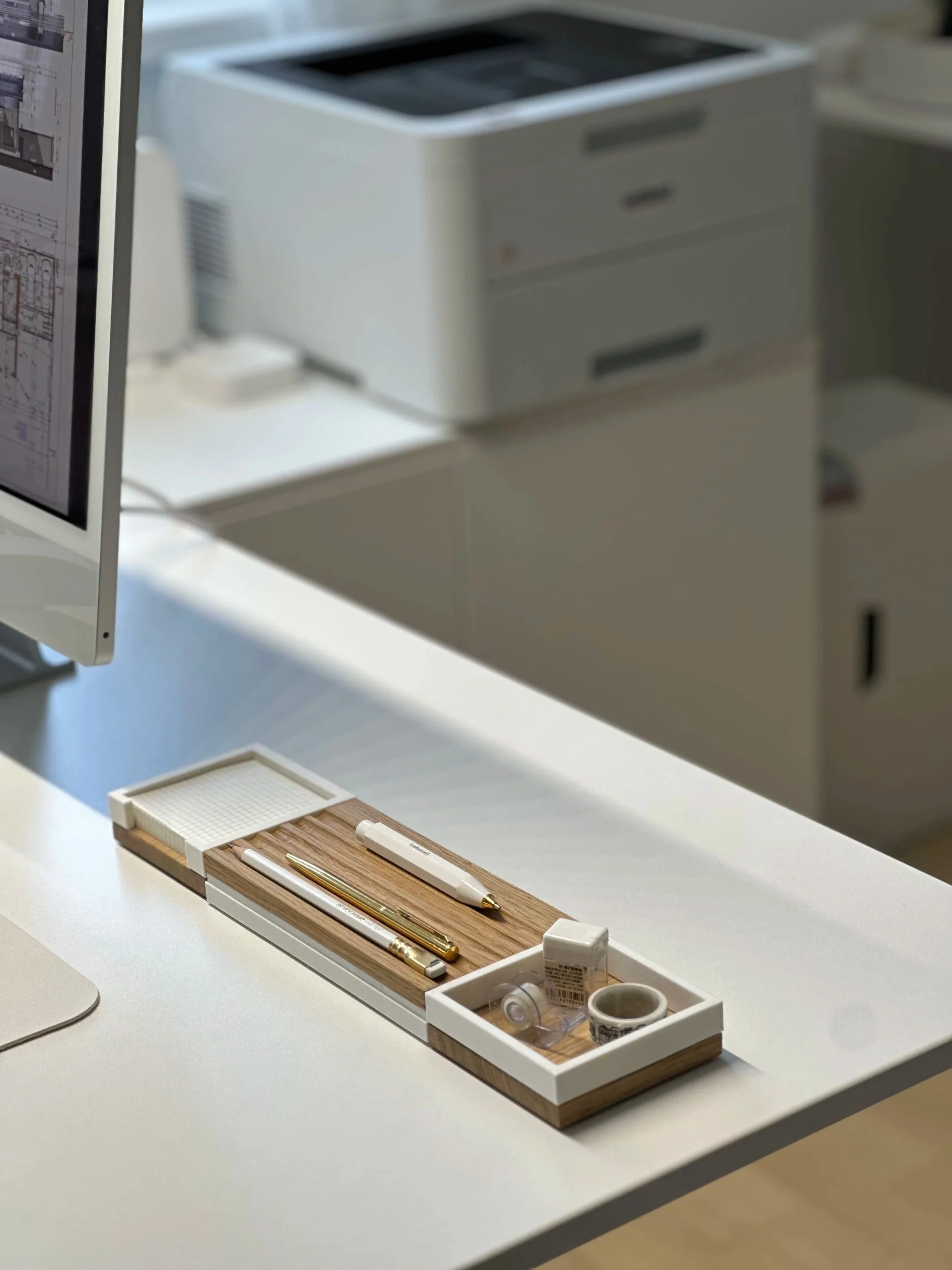 Stiftablage: Ablage aus europäischem Eichenholz natürlich geölt, Boden aus PLA Matte Cotton White