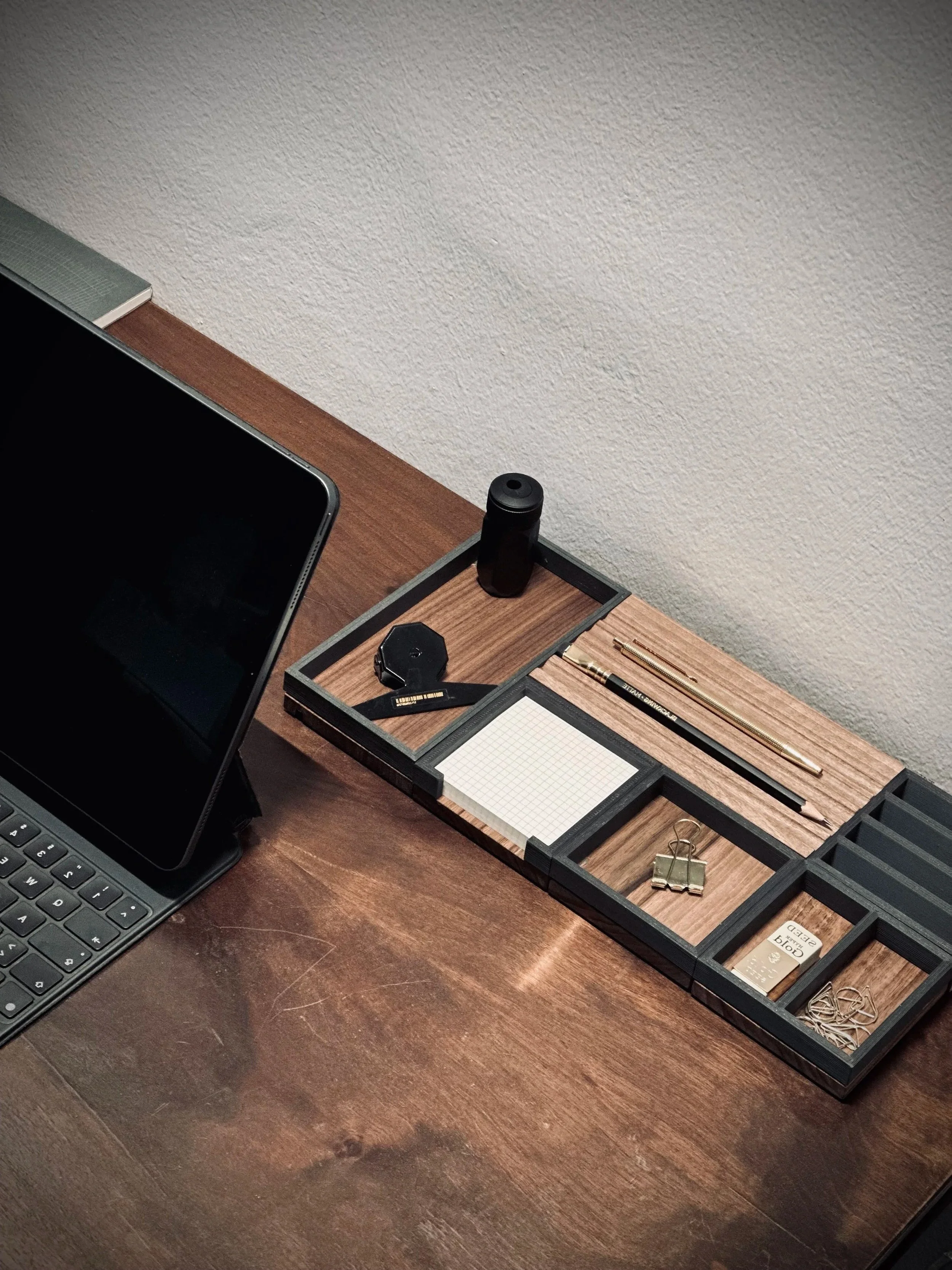 Verwandle deinen Schreibtisch in einen Ort der Klarheit und Inspiration – mit unserem modularen Tisch Organizer System aus massivem Holz und modernem Design.